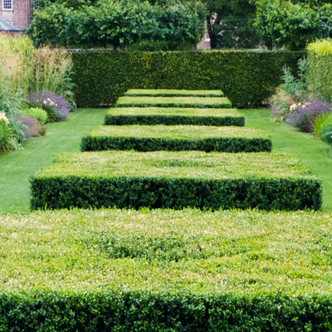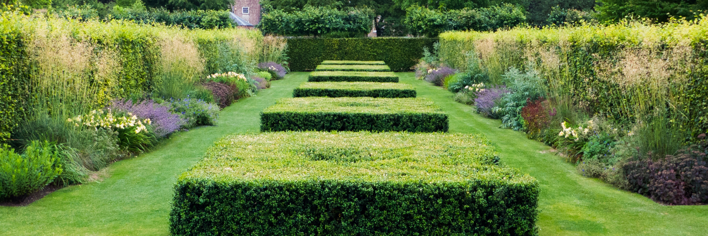 At Scampston, serpentine forms of yew, cubes of box, pleached limes,